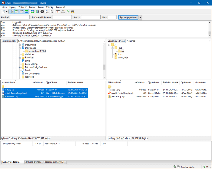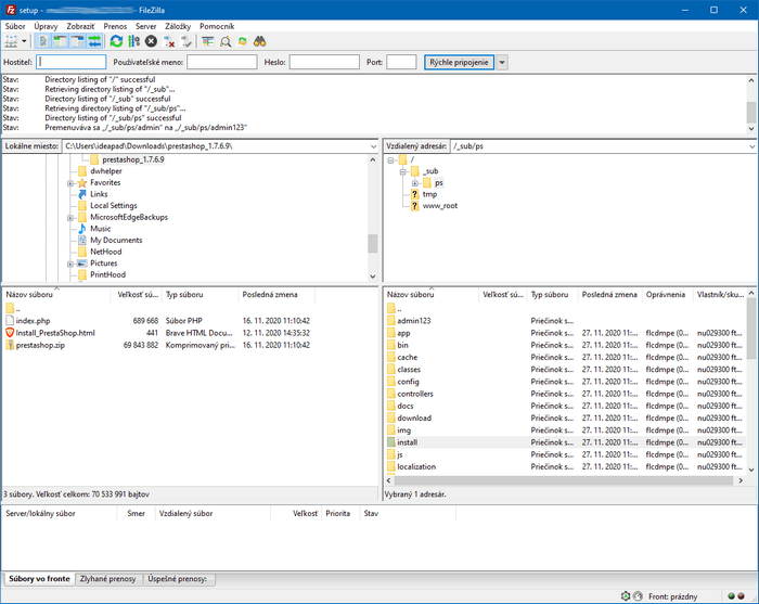 3. Stiahnutý inštalačný súbor PrestaShop_x.x.x.zip rozbaľte na lokálnom počítači do ľubovoľného adresára. Pripojte sa pomocou FTP pripojenia do adresára na vašom webhostingu. Inštalačné súbory môžete nakopírovať na koreňový (root) adresár (súbory PHP budú priamo na koreni) - vtedy by bol internetový obchod dostupný na adrese napr. www.vasa_domena.sk. Alternatívne môžete inštalačné súbory nakopírovať do podadresára s názvom napr. eshop (niektoré hostingy majú na to vyčlenený špeciálny adresár _sub). Vtedy bude internetový obchod dostupný na adrese www.vasa_domena.sk/eshop prípadne eshop.vasa_domena.sk – podľa nastavenia hostingu. Samozrejme, pomocou tzv. aliasu má správca webhostingu priestor na úpravu, predchádzajúce uvedené možnosti sú uvedené len ako príklady.