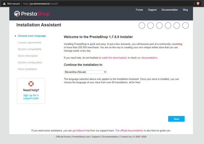 Táto téma Pomocníka popisuje inštaláciu internetového obchodu PrestaShop. Keďže ide o e-shopovú platformu, ktorá sa dynamicky vyvíja, obsah a vzhľad PrestaShopu podlieha neustálym úpravám a zmenám. Priebeh inštalácie popísaný v tejto téme je platný k novembru 2020 a verzii 1.7.6.9 – v nasledujúcich verziách sa môže postup krokov, prípadne vzhľad inštalácie líšiť.