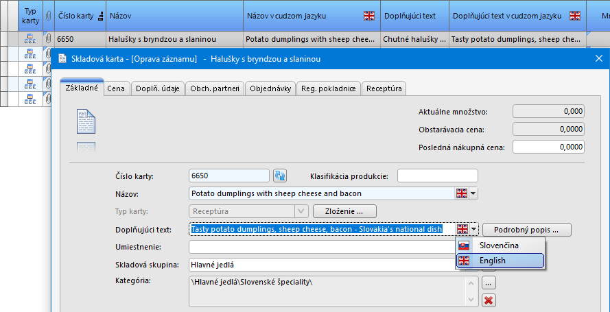 - Po pridaní daného štátu (jazyka) pribudne v jednotlivých evidenciách pri položkách rozbaľovací zoznam s možnosťou výberu ikony vlajky daného štátu na zadanie prekladu položky do príslušného poľa.