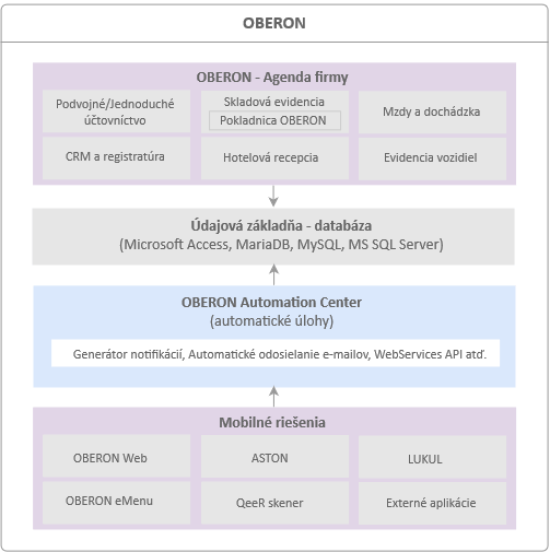 - OBERON - Agenda firmy - program, ktorý tvorí základ celého systému. Obsahuje všetky knihy (evidencie, agendy), ktoré OBERON ponúka. Je to program, s ktorým pracuje bežný používateľ.