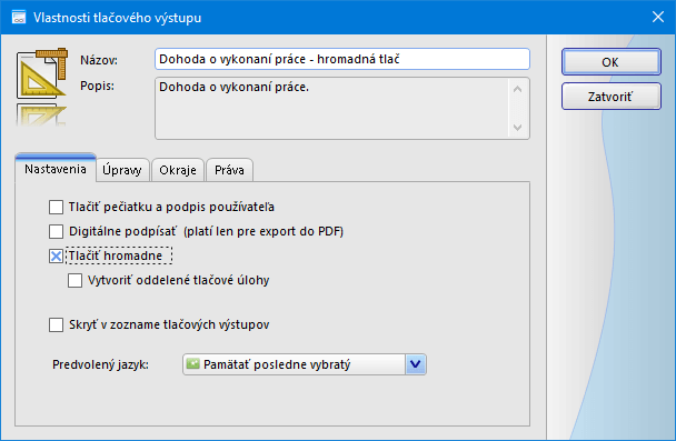 - Upravte názov tlačového výstupu, napr. Dohoda o vykonaní práce - hromadná tlač.