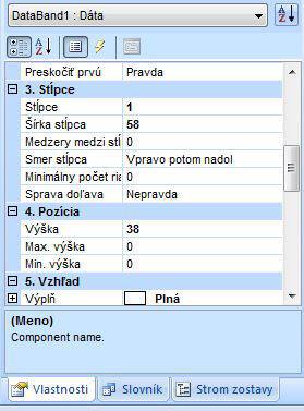 - V Editore tlačových výstupov myšou označte dátový zdroj DataBand1 a v postrannom paneli zmeňte jeho Vlastnosti: