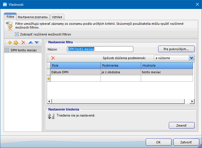 - Pri každom filtri je možné nastaviť vlastné triedenie, podľa ktorého sa zoradia vyfiltrované záznamy v danej knihe.