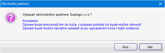 - Nastavenie zobrazovania záznamov v koši a možnosť vyprázdniť (vysypať) kôš sú dostupné vo formulári Vlastnosti. Tu je možné nastaviť, či sa v evidencii majú zobraziť aj záznamy v koši, t. j. tie, ktoré už boli vymazané. Záznamy v koši (vymazané záznamy) sa v tomto prípade zobrazujú ako prečiarknuté. Vymazané záznamy v koši nie je možné upravovať, v prípade potreby je možné jeden konkrétny záznam z koša obnoviť, prípadne natrvalo vymazať (stlačením tlačidla Vymazať).