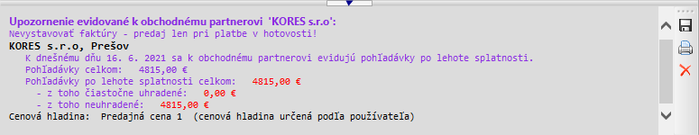 - Pri vytváraní dokladu a na samotnom doklade je možné overiť platnosť IČ DPH obchodného partnera prostredníctvom databázy uloženej v serveri firmy EXALOGIC. Databáza sa aktualizuje z databázy Finančnej správy SR každý deň, informácie sú preto vždy aktuálne. Overiť IČ DPH je možné stlačením tlačidla