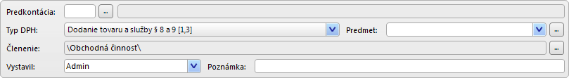 - Horná časť formulára dokladu sa líši pri rôznych druhoch dokladov. Údaje, ktoré obsahuje, sú dôležité pre účtovanie, spätnú kontrolu dokladov a tlačia sa v tlačových výstupoch.