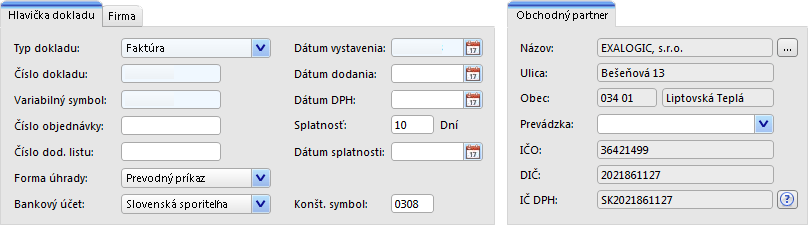 - Hlavička dokladu zobrazuje a umožňuje meniť nastavenia zadané v sprievodcovi tvorbou dokladu (typ dokladu, druh pohybu, číslo dokladu, dátum). Zároveň umožňuje zadať ďalšie údaje (formu úhrady, dátum dodania, splatnosť atď.). V hornej časti formulára sú uvedené aj údaje o firme, prípadne prevádzke, a o obchodnom partnerovi.
