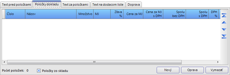 - V závislosti od druhu dokladu umožňuje vybrať položky zo skladových kariet alebo neskladové položky zadané ako text bez prepojenia na skladovú evidenciu (začiarkavacie políčko Položky zo skladu).