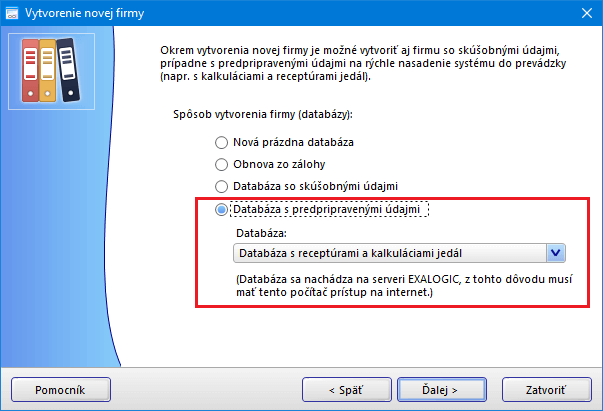 Na ukážkové účely je k dispozícii vzorová databáza pre reštauračné prevádzky s receptúrami a kalkuláciami jedál. Databáza je dostupná priamo v programe