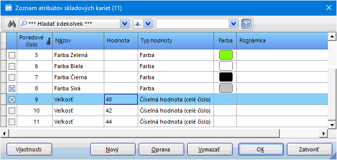- Atribúty je možné definovať v číselníku Zoznam atribútov skladových kariet v ponuke Firma, Predvoľby, Skladové karty - atribúty. Číselník je dostupný aj z formulára Variant skladovej karty, záložka Základné, Atribúty variantu, tlačidlo
