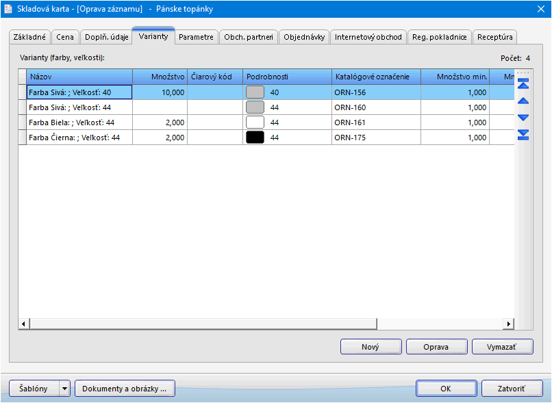 Obrázok č. 2: Skladová karta, záložka Varianty