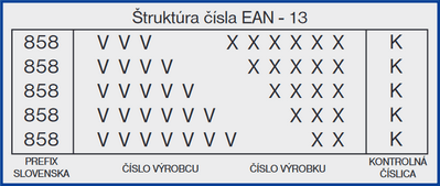 - Prvé číslice (prefix) určujú štát pôvodu (napr. Slovensko má číslo 858), ďalšie číslice určujú výrobcu (číslo výrobcu) a nasledujúce číslice, okrem poslednej, určujú konkrétny tovar (číslo výrobku). Posledná číslica je kontrolná.