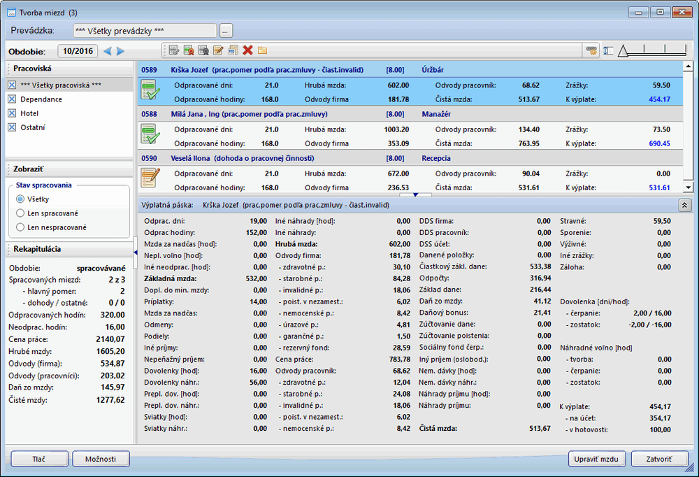 - Samotné spracovanie miezd sa vykonáva v evidencii Tvorba miezd. Po otvorení knihy sa zobrazia predvypočítané mzdy pracovníkov na základe nastavení pracovných pomerov. Po označení kurzorom mzdy, ktorú chcete spracovať, sa v dolnej časti formulára oddelenej rozdeľovacou lištou zobrazí príslušná výplatná páska. Pri zmene akejkoľvek mzdovej zložky alebo neprítomnosti sa mzda ihneď prepočíta a výplatná páska sa zobrazí so zmenenými položkami. Pri mzde pracovníka možno evidovať rôzne stavy a štádiá jej rozpracovanosti - nespracovaná mzda, koncept, spracovaná a podpísaná (odsúhlasená) mzda.
