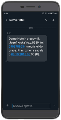 - Notifikácia o meškajúcich pracovníkoch sa zasiela zodpovednej osobe vo forme e-mailovej alebo SMS správy na zadanú adresu alebo telefónne číslo v prípade, že pracovník nepríde do práce do stanoveného času (t. j. po prekročení stanoveného času od začiatku pracovnej zmeny).