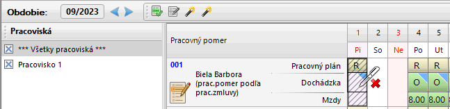 - V prípade, že bola spolu s pracovným plánom vygenerovaná aj dochádzka, je potrebné danú časovú zložku dochádzky vymazať. POZOR: vymazať je potrebné len časovú dochádzku, nie však pracovný plán (pracovnú zmenu). Napr. vymaže sa len časová zložka dochádzky Odpracované (O), nie však pracovný plán (zmena) Ranná (R) (pozri Obrázok č. 1).