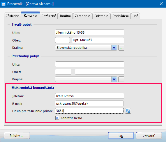 - Výplatná páska sa odosiela ako príloha vo formáte PDF na e-mailovú adresu pracovníka evidovanú vo formulári Pracovník, záložka Kontakty. Ak je tu zadané aj Heslo pre zasielanie príloh, výplatná páska bude zabezpečená týmto heslom. Ak heslá generuje účtovná jednotka, je potrebné ich doručiť pracovníkom, napr. zaslaním SMS.