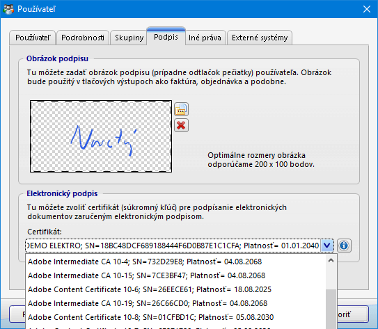 Obrázok č. 1: Priradenie podpisového certifikátu používateľovi vo formulári Používateľ, záložka Podpis